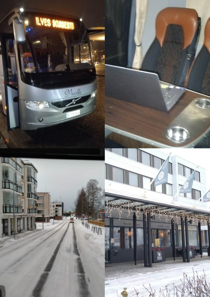 Lähdimme Tampereen linja-autoasemalta kello kahdeksan ja suuntasimme majapaikkaamme Tornioon. Olin valinnut hotelliksemme Park hotellin, jossa tulisimme viettämään kaksi yötä, kuten myös Ilveksen joukkue. Lähtiessämme Tampereelta satoi vettä ja maa oli vihreä, päästessämme Tornioon olikin täysi talvi. Itse ajomatka meni oikein jouheasti kolmeen pysähdyksen kera, joista pisin kesti 45 minuuttia, jolloin pidimme mennen tullen lounastauon sekä kuljettajan pakollisen pitemmän tauon. Tornioon saavuimme klo 17:24 ja kirjauduimme hotelliin. Mainittakoon, että linja-autossa oli hyvin tilaa ja jokaisella useampi penkki käytössä. Matkan mukavuutta lisäsi takana ollut kahdeksan hengen pöytäryhmä, jossa myös itse pystyin tietokoneella työskentelemään yhdistyksen asioita.