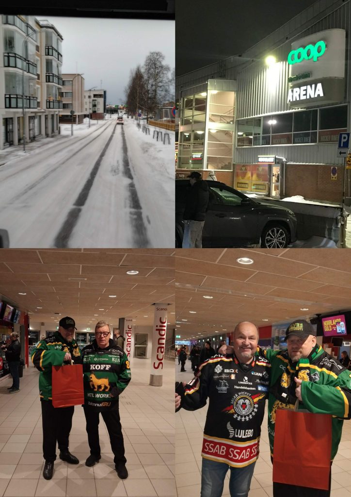 Kellon tullessa 16 lähdimme todella huonossa ajokelissä kohti Luulajaa. Matkaahan sinne oli vain noin 150 km, mutta kelin vuoksi jouduimme kaksi kertaa pysähtymäänkin Jirin käydessä pyyhkijän sulkia putsaamassa. Aikaa oli kumminkin hyvin, ottelun alkaessa Suomen aikaa kello 19, niin hyvissä ajoin olimme perillä. Luleån areenan parkkipaikalle saavuttaessamme olikin vastassa suomea puhuva järjestysmies ja hallissa oli useampiakin oikein hyvin suomea puhuvia työntekijöitä. Itse areenaan mahtui reilu 6000 katsojaa, mutta valitettavasti tunnelma oli surkein niistä Euroopassa kiertämistämme otteluista, missä olemme olleet. Syynä suurimmaksi osaksi olikin vain 1814 katsojan paikalla olo.
