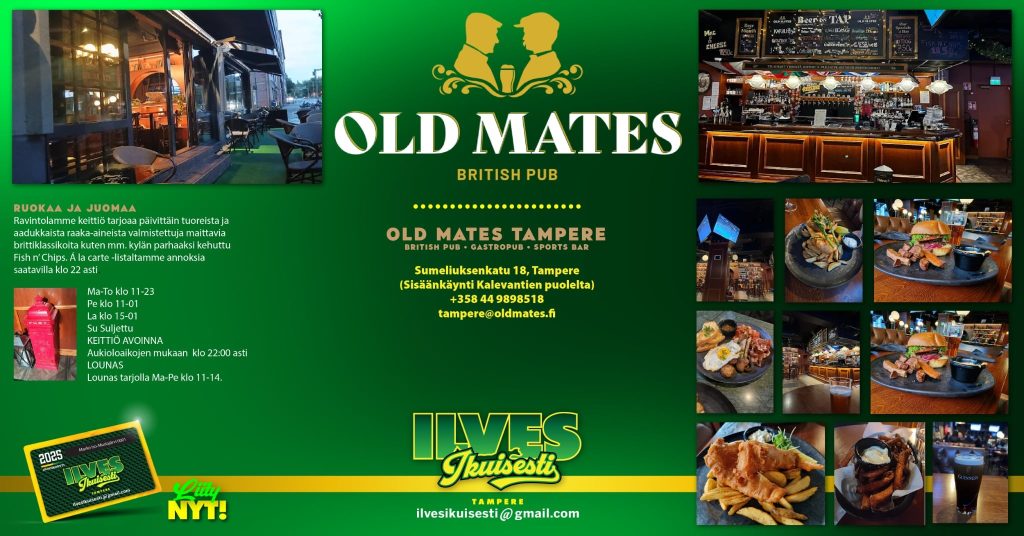 PUB OLD MATES sijaitsee aivan Nokia Areenan tuntumassa. Jäsenien edut tulevat lähiaikoina esille, nehän saa ainoastaan jäsenkortti anäyttämällä.