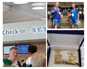 Lentokentällä paluupäivänä oli samoissa puuhissa Liettuan Olympiajoukkue, ja heidän isoin tähtensä, 22-vuotias Mykolas Alekna.  Hän voitti Pariisissa Olympiahopeaa (myös MM hopea  2025 ja 2022, MM pronssia 2023, EM kulta 2022, EM pronssia 2024).  Mykolas Alekna on tästä huolimatta vaatimaton kaveri, ehkä vähän ujokin?  Kävin antamassa hänelle Yleisurheilufanit ry:n puolesta pienen palkinnon, kalvosinappi ja solmioneulasetin.   Antoi Liettuan Olympiapinssin vastalahjaksi.