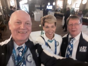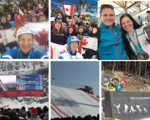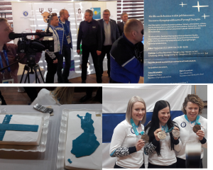 Tuttuni Petri Kalliola, joka asui siihen aikaan Koreassa, oli saanut diilin Olympiakomitean ja Ulkoministeriön kanssa. Toin Peten pyynnöstä Olympiakomitealle Helsingistä yhden tärkeän varaosan ja siitä palkaksi pyysimme pussillisen Olympia-pinssejä.  Yllätyksenä saimme vaivanpalkaksi myös kutsun Suomen joukkueen mitalikahveille, jossa olisi ollut myös presidentti Niinistö, mutta Aaro-poika oli juuri silloin syntymässä.  Paikalla olivat urheilijoiden lisäksi mm. ulkoministeri Timo Soini,  urheiluministeri Sampo Terho, Korean suurlähettiläs Eero Suominen, kv-Olympiakomitean Sergei Bubka puhui, tarjoilujen houkuttamana Suomen Olympiakomitean pääsponsorit  ja 2 katsojaa Suomesta😊 (minä ja Risto).   Suomen 2 x pronssimitalisti Krista Pärmäkoski aloitti kakunleikkauksen  (lisäksi Krista voitti vielä hopeamitalin tämän jälkeen 30 km matkalta) , naisten jääkiekkojoukkue voitti pronssia, mitalikahveilla heitä edusti Isa Rahunen ja Minnamari Tuominen.  Hieno persoona, silloin vasta  18-vuotias Rene Rinnekangas, oli paikalla käsi paketissa (osallistui silti BigAiriin).  Komeeta Suomi-täytekakkua saimme mekin ottaa. Suurlähettiläs Suomisen kanssa oli hyvät jutut.  Pohjois-Korean sotaisuus toi kuulemma omat vivahteet toimintaan… Meidän Leijona-kuosin Reino-kengät valokuvattiin tilaisuudessa ja julkaistiin suurlähetystön Insta-tilillä, luvallamme😊.