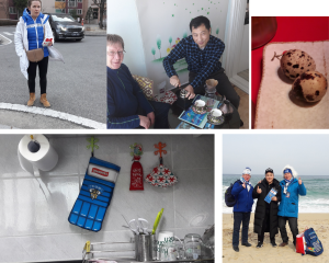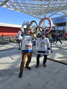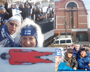 Neljäs: 2018 oli vuorossa Kaakkois-Aasia ja Korean PyeongChangin talviolympialaiset. Mulla oli silloin sellainen Finnairin kortti, että sain ottaa 53 kg matkatavaroita. Ja otin kans!  Hiukan oli haasteita, kun niitä kamoja pitkällä matkalla liikutteli, mutta kaikki ne romppeet oli  niin tarpeellista: laukussa oli mm. kaverin vanhat aidosti hikiset pelihousut ja aito pelikypärä yms. rekvisiittaa, jota ei tarvinnut onneksi palauttaa Suomeen.  Eka viikko asuttiin korealaisessa perheessä, tampereenkokoisessa Gangneungin kaupungissa. Siellä oli kaikki jäälajit. Perhemajoitus oli hieno elämys!  Korealaisperhe kohteli meitä kuin parhaita ystäviä.   Toinen viikko asuttiin jäähallin vieressä suomalaisten täyttämässä pikku hotellissa.  Jäähallissa jouduttiin myös Jethro Rostedtin TV-ohjelman haastatteluun.  Syötiin joka päivä välipalaa jäähallin viereisessä paikallisten ravintolateltassa, yhtenä päivänä tilattiin hotdogit, ihmeteliin kun ei ollut nakkia, vaan olikin grillitassun näköinen täyte sämpylässä?  Selvisi että oli todellakin ”hot dog”-lihaa!  Koiraa siis…Koreassa yleistä, vähitellen on jäämässä kuulemma pois.