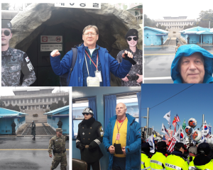 Kisojen jälkeen olimme vielä turisteina vajaan viikon: Pääkohde oli Soul ja lisäksi Koreoiden raja-alue DMZ-vyöhyke. Päästiin tunneleihin, ja siniseen taloon. Oikea alakulma: mielenosoitus Gangneungissa, jossa vaaditaan hyökkäämään Pohjois-Koreaan ja vapauttamaan vangit jne