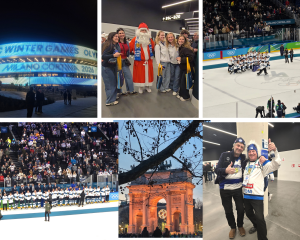 yläkuvat: jäähalleissa kypärät, pelipaita ja pelihousut yllä. Krista ja joukkueenjohtaja Mika Kojonkoski, annoimme ruusun Kristalle tässä kohtaan. Kävimme monissa lajeissa mm. Hiihdot, ampumahiihto, mäkihyppy, lumilautailu, kelkkailu, jääkiekko, taitoluistelu, curling