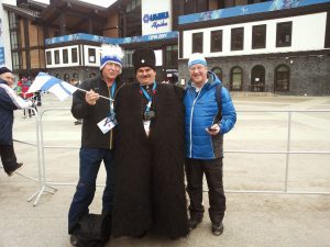 Ukrainalainen kasakkapäällikkö, eli Atamaani Sotsin kisoissa Reijo Lammin ja Kari Laitalan kanssa. Toivottavasti ehti kotiin ennen Krimin valtausta kisojen jälkeen….