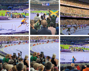 Jo perinteiseen tapaan kävimme beachvolley-otteluita katsomassa, kisapaikka oli tehty Eiffel-torin juurelle, ja hienot valoshow:t tuli kaupanpäälle.  Eniten kävimme Stade France yleisurheilustadionilla (81 000 paikkaa, rakennettu 1998 futiksen MM-kisoja varten).   Muutaman kerran pääsimme täälläkin valmentajakatsomoihin, omatekemät kaulapassit auttoivat asiaa….Miesten golfin finaalipäivä oli melko kaukana Pariisin ytimestä, (1,5 tunnin juna-bussimatka per sivu) seurattiin kisapäivä kokonaan (hieno systeemi, kun voit seurata katsomosta tai seurata vaikka koko kisan kulkemalla huippupelaajien mukana aivan lähellä, kentän reunalla).  Melontastadionilla oltiin 1 kisapäivä, mielenkiintoinen laji tämäkin. Monta lentopallo-ottelua katsottiin. Nyrkkeilyssä oltiin usempana päivänä, näissä näki aina ison määrän otteluita kerralla.  Nähtiin mm. tamperelainen Pihla Kaivo-oja kehässä. Kerran päästiin puolivahingossa VIP-tilaisuuteen Pariisin keskustan ravintolaan (kuva).