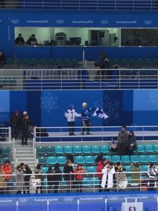 Olympialaisten aikana Etelä- ja Pohjois-Korean välillä oli poikkeuksellisen rauhaisa tunnelma.  Heillä oli mm. molempien maiden yhteinen naisten jääkiekkojoukkue, joka pelasi myös Suomea vastaan, tulos 8-0 Suomelle.   Lisäksi Pohjois-Korealla oli näyttävä 200 naisen Cheering-ryhmä, katsomossa heillä oli punaiset asut ja hiihtostadionilla mustat.  He toimivat johdetusti kuin robotit.  Miespuolinen sotilas antoi naisille käskyt miten toimitaan.  Yritimme haastatella heitä, mutta he ilmoittivat jämäkästi, ettei keskustelu ole sallittua.  Kuvien ottamista he eivät pystyneet estämään😊.