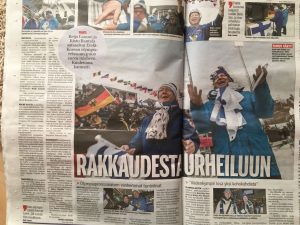 Iltasanomien kuvaaja kiinnitti meihin huomiota, kun oli nähnyt meidät jo useissa eri tapahtumissa,  hän ehdotti jutun tekemistä. Suostuttiin. Tunnettu toimittaja/kirjailija Marko Lempinen haastatteli ja kirjoitti jutun, maineikas kuvaaja Pete Aarre-Ahtola tuli puoleksi päiväksi mukaamme, ja antoi ohjeen, että olkaa niin kuin hän ei teitä seuraisikaan.  Iltasanomiin tuli melkein aukeaman kokoinen juttu, jossa paljastettiin mm. iso kisabudjettimme (1 vuoden säästöt meni tähän) . Sai kotiväkikin sen nyt tietää lehdestä lukemalla, heh heh😊!