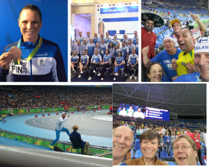 Mira Potkonen toi Suomen ainoan mitalin Riosta, presidentti Niinistö ja rouva olivat paikalla mitalikahveilla. Värikästä yleisöä, joka halusi kannustaa vävykokelastamme moukarin finaalissa. Keihäässä Antti Ruuskanen meinasi myöhästyä heittovuorostaan…Alakuvassa Rauno Rajala, tuttumme Riossa.  Rauno antoi meille hyvät turvallisuuskoulutukset Riossa.  Hän säilytti luottokorttiaan boxereiden taskussa!