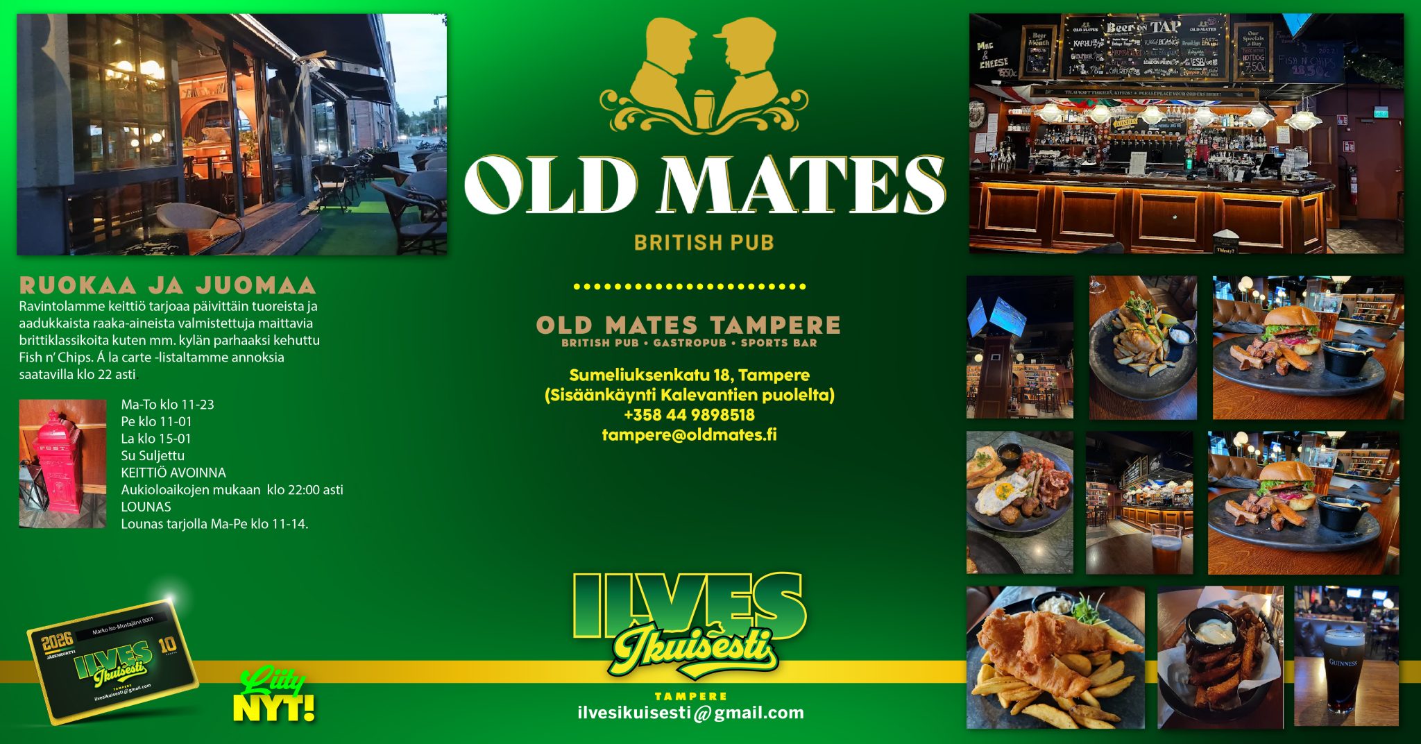 Tampereen Old Mates tarjoaa monipuolisen urheilutarjonnan lisäksi laajan ja vaihtuvan juomavalikoiman sekä alusta asti itse tehtyä, laadukasta brittipubiruokaa. Olemme tutun tunnelmallinen mutta samalla moderni sekä uudenlainen olohuone ja ravintola kaikille brittipubien ystäville.